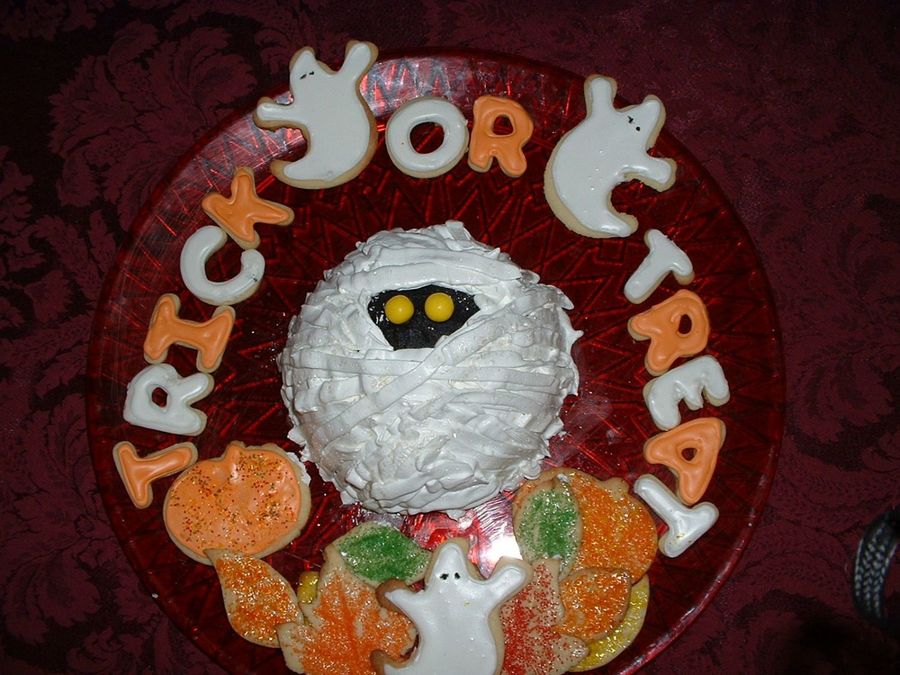 devil's food mummy cake with whipped cream buttercream frosting with NFSC in holiday shapes. Just a little tray of Halloween goodies for the nneighbors