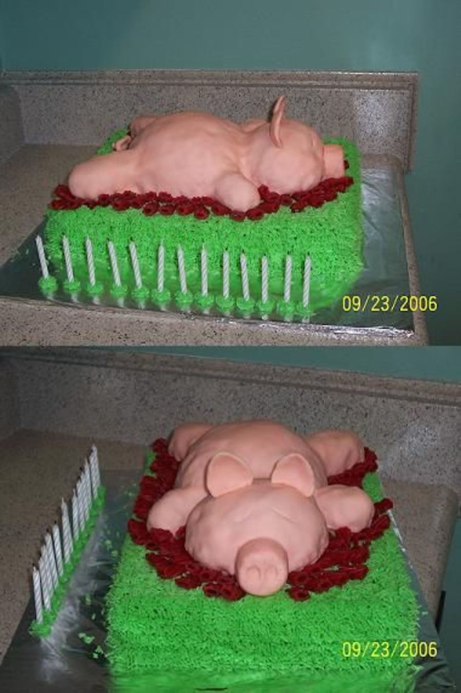 The pig is molded rice krispie treats covered with mmf on top of white cake with bc icing. The "fire" is red licorice. This was my first attempt at rice krispie molding and it was not as easy as I imagined. This was my son's birthday cake and he was happy with it, so that's all that matters.