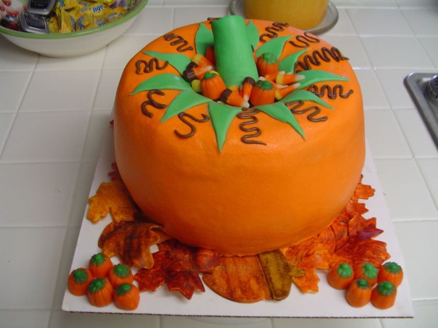 Carrot cake frosted with vanilla buttercream tinted orange. Stem and leaves made out of fondant.