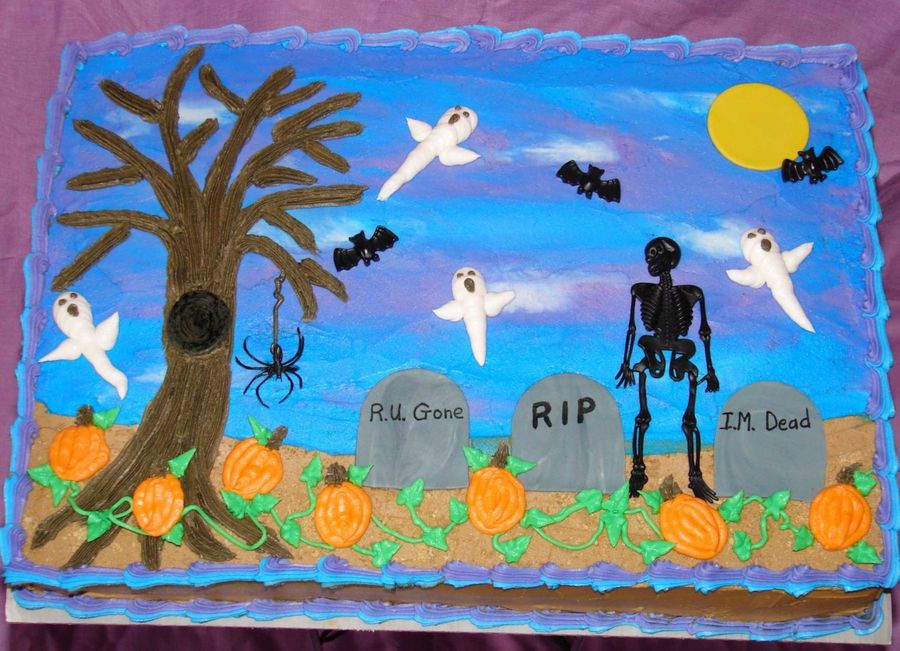 This is a 12"X15" single layer vanilla sheet cake tinted orange. Iced and decorated with butter cream. Dirt under tombstones is crushed graham crackers and brown sugar. The tombstones, moon and knot in the tree are fondant. Bats, spider and skeleton are plastic decorations. Made for a neighborhood Halloween parade after party as a donation.