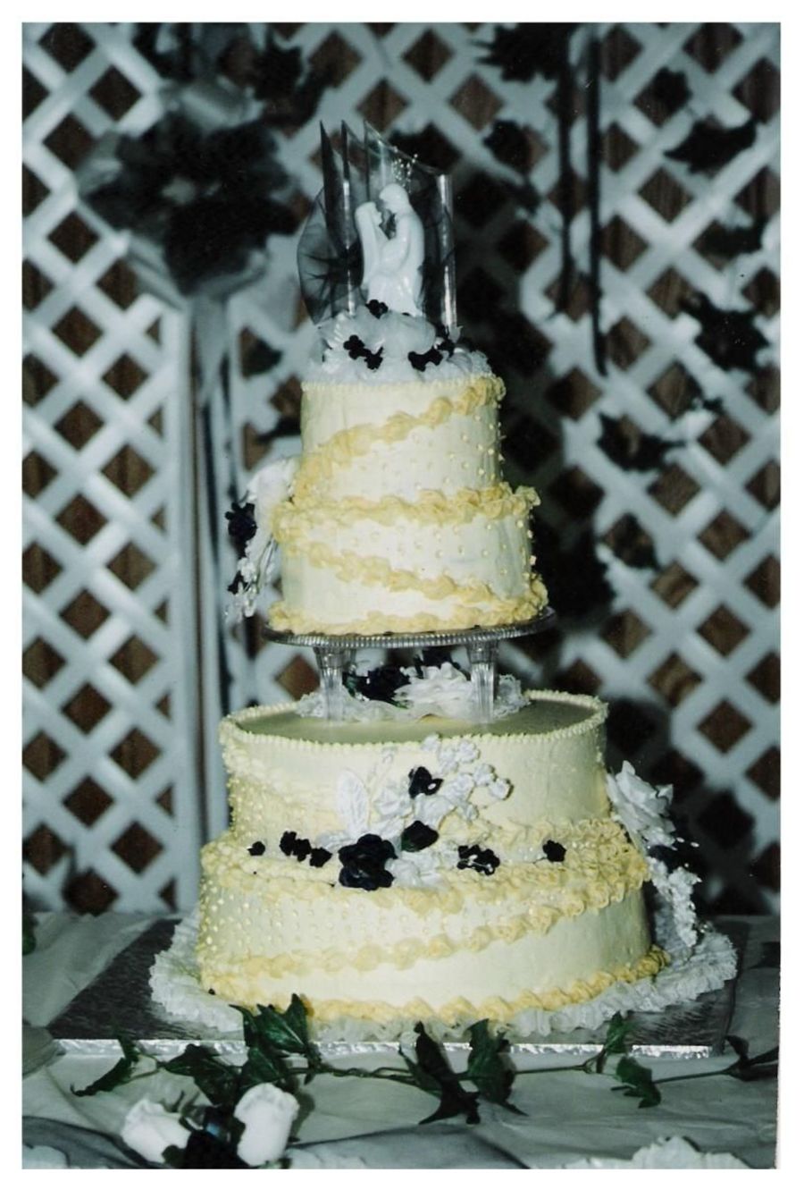 I made this for my sister about 10 or 11 years ago? I can't even remember how long she's been married. I hadn't been decorating long, and this was my first wedding cake and tiered cake. Most of the decoration fell off.. Middle of June, no air conditioning in the car, so I had to do all the border all over again at the church. Also, my mother put the the top tiers on, because I was getting ready (bridesmaid), and I think she jammed it through one of the cardboards because it's shorter on one side.