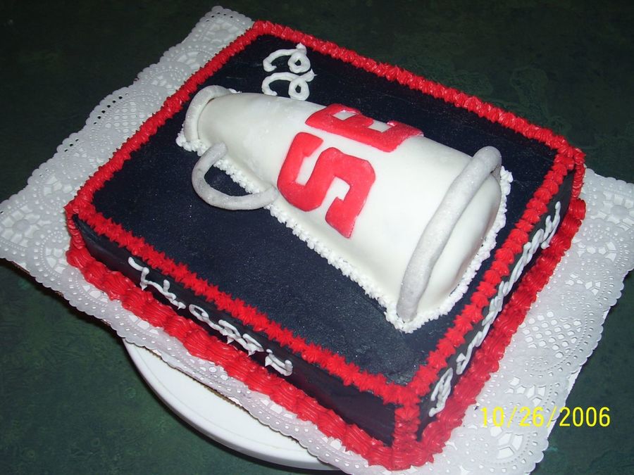 chocolate 9x12 cake, cut down to 9x9 using excess cake to form megaphone on top. Cake iced in buttercream, fondant covered megaphone and college lettering.