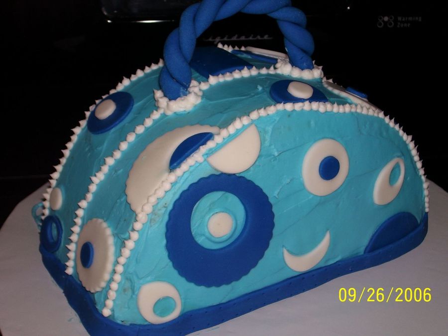 Made from 2-9" rounds held together with stiff buttercream, iced in buttercream, decorated w/fondant accents and handle.