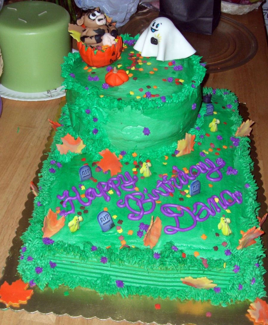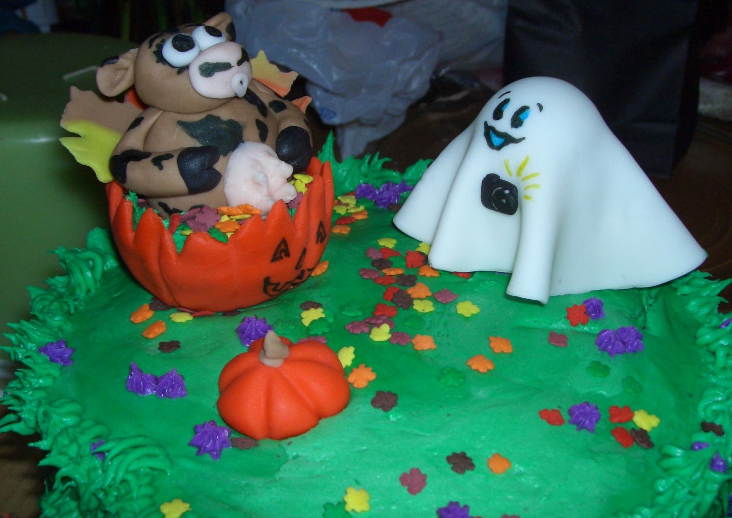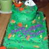 My first cake for pay (it was a friend). Chocolate cake, bavarian cream filling, buttercream frosting, sugar accents, fondant figures and large leaves.