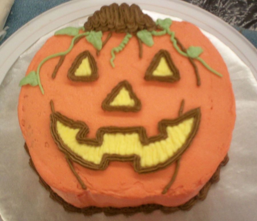 I had my final the day before Halloween, so you know I had to use my techniques on a pumpkin. I "carved" my pumpkin out of an 8 in circle cake. I like it! It could have been better if I decorated it in my own kitchen, but I'm still happy. :D