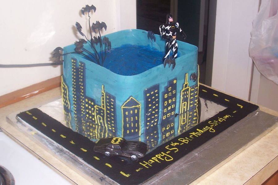 I was asked to do a batman cake with 3 days notice, ye not a problem I said, day before b-day still did'nt know what I was going to do, has a browse at the batman cakes in the gallery got a couple of ideas(cos boy was I having a cake block) and this is what I came up with. Everything is edible except the batman figure and the wire holding the bats. Thank goodness for cake central.