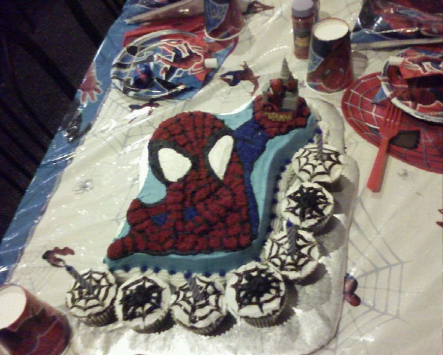 This is a Spiderman character cake. This is a chocolate cake with chocolate pudding filling. The red icing is chocolate buttercream colored red. The cupcakes were extra batter I had and decided to play around with some ideas. They all have spiderwebs made of chocolate and some have piped spiders.