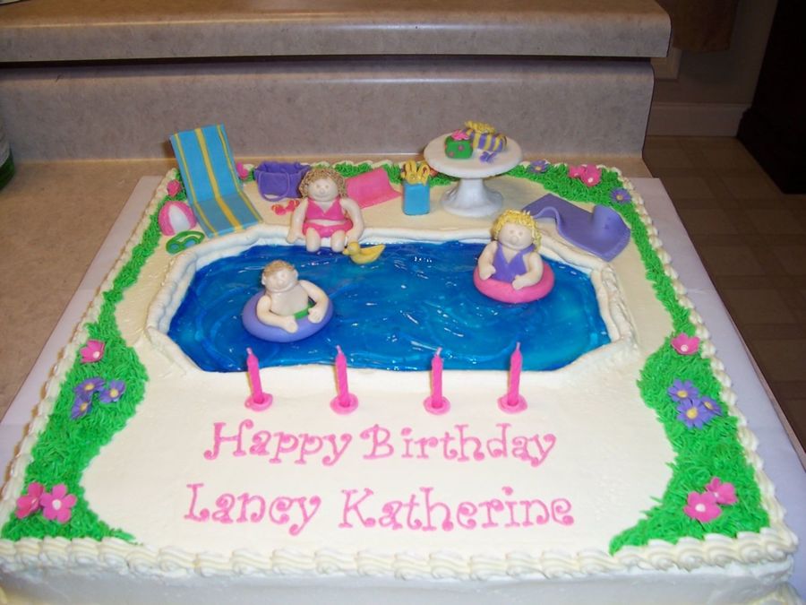 This cake was for a little girls pool party. It is a yellow cake with buttercream icing and piping gel for the water. All of the decorations are made from MMF.