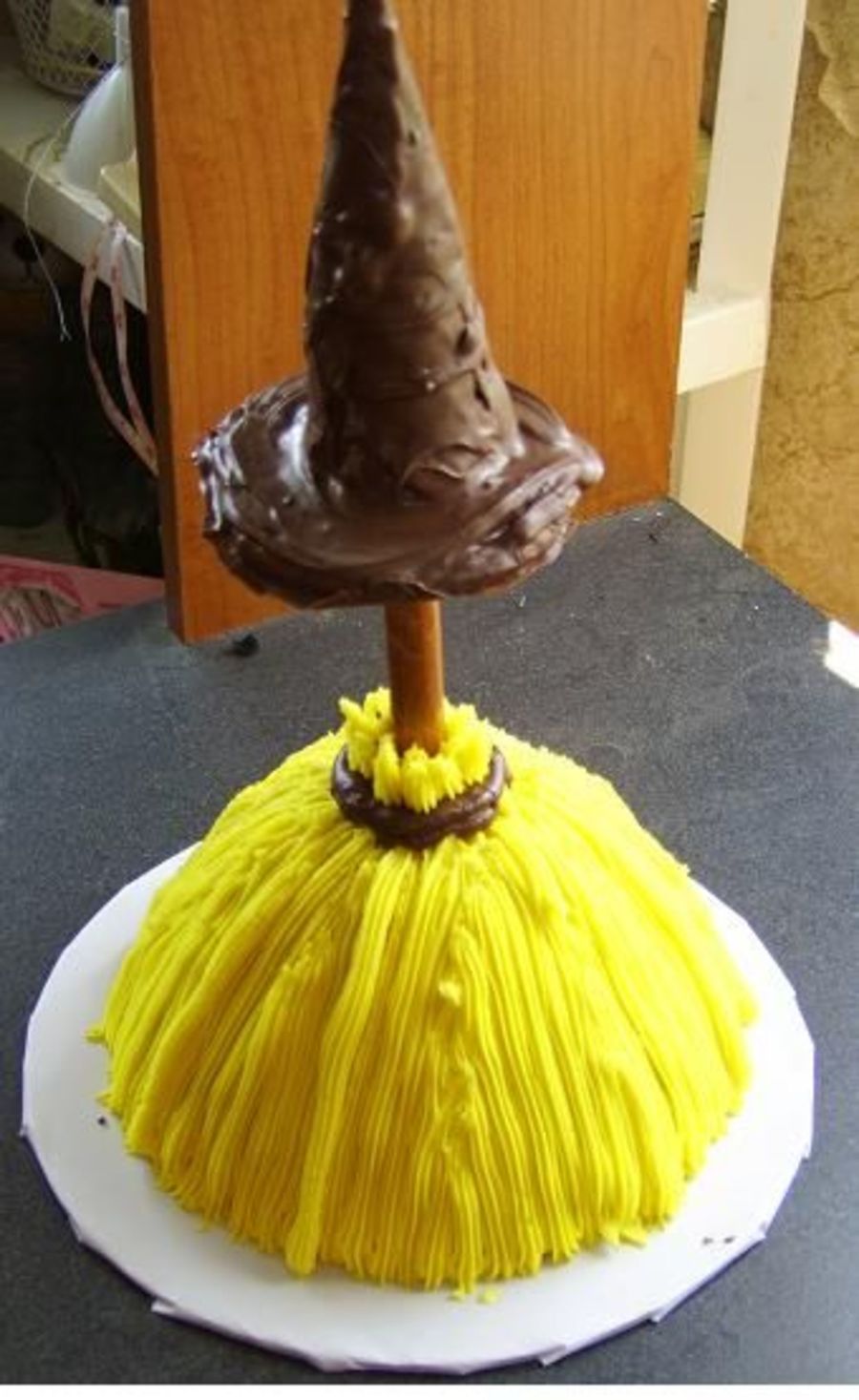 This is a broom cake ( Wilton 2008 yearbook) that I whipped up real quick for DS because he wanted something for the Harry Potter book release. I also made a witch hat from a cookie and icecream cone dipped in chocolate. It's not the best looking cake but he was pleased.