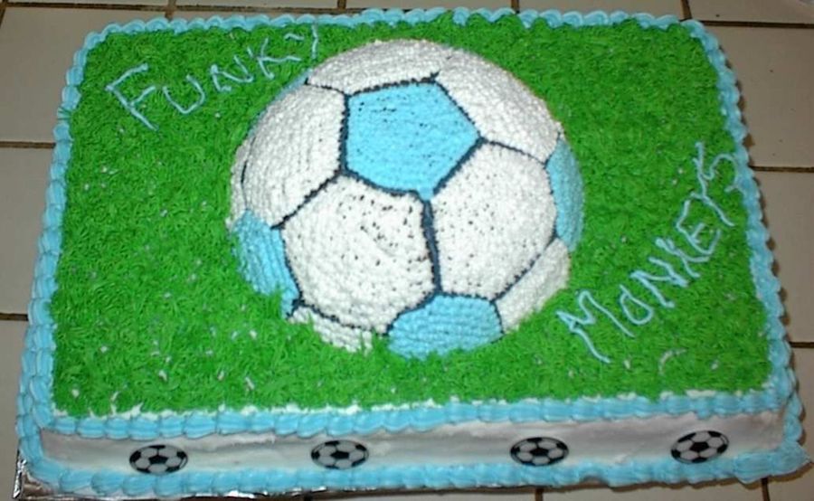 Did this cake for my granddaughters end of season soccer party. Had problems witht getting smooth icing so I ended up doing the whole top in grass. Did the soccer ball in their team colors. Still need alot of practice but I like how it turned out and the kids loved it.