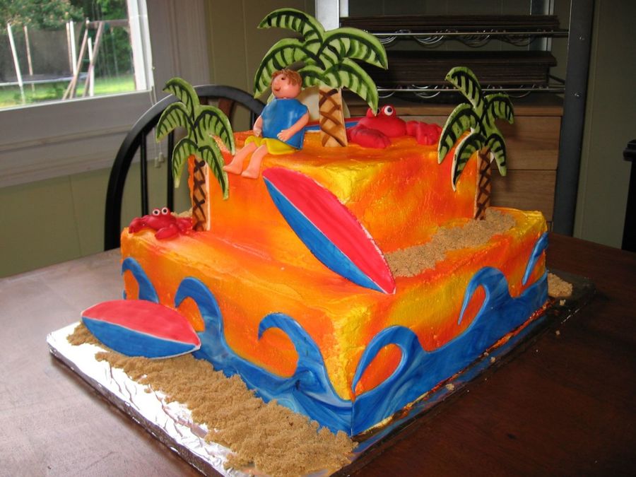 Sugar_Plum_Fairy on 10 Aug 2007 , 8:18am I love the colors of sunset that you based the cake in! Great job on that figure, the palm trees, boards and crab! Very well done!