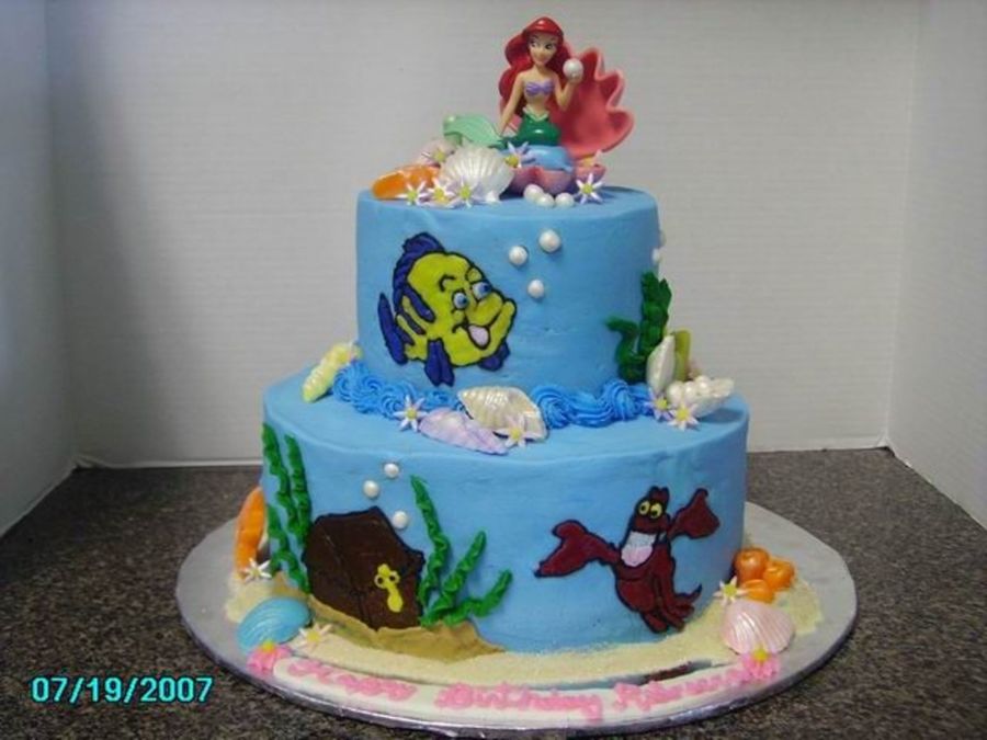 This is a double 10" and double 6" All BC icing w/ fondant accents and Ariel is a toy figurine.