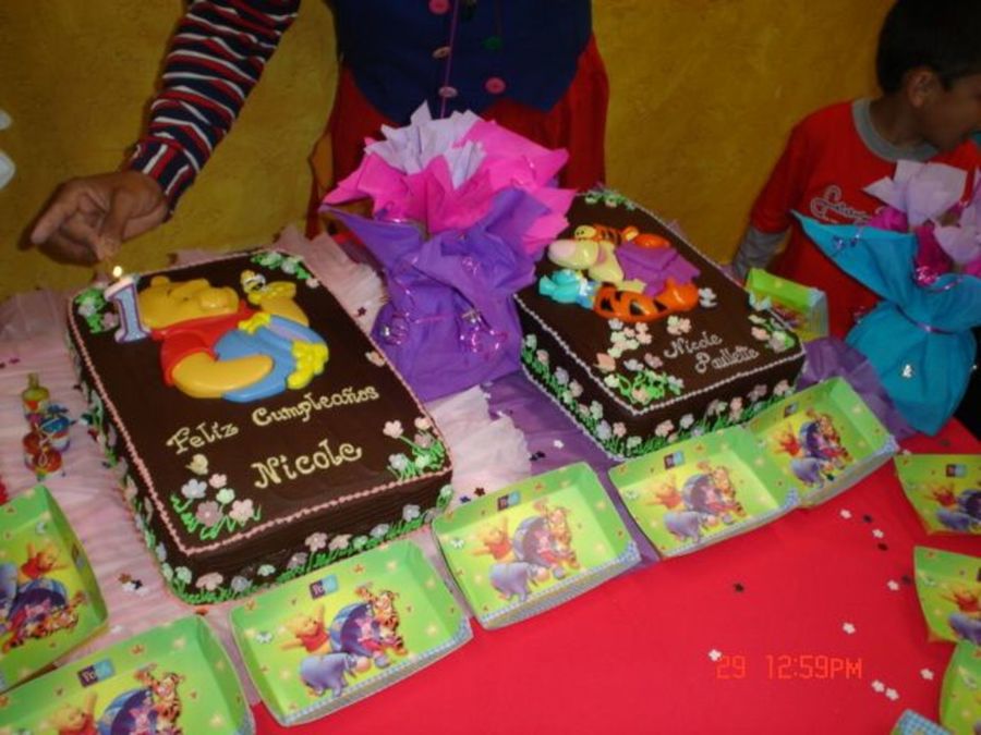 Chocolate cake decorated with gum paste flowers and winnie pooh and tigger puzzle