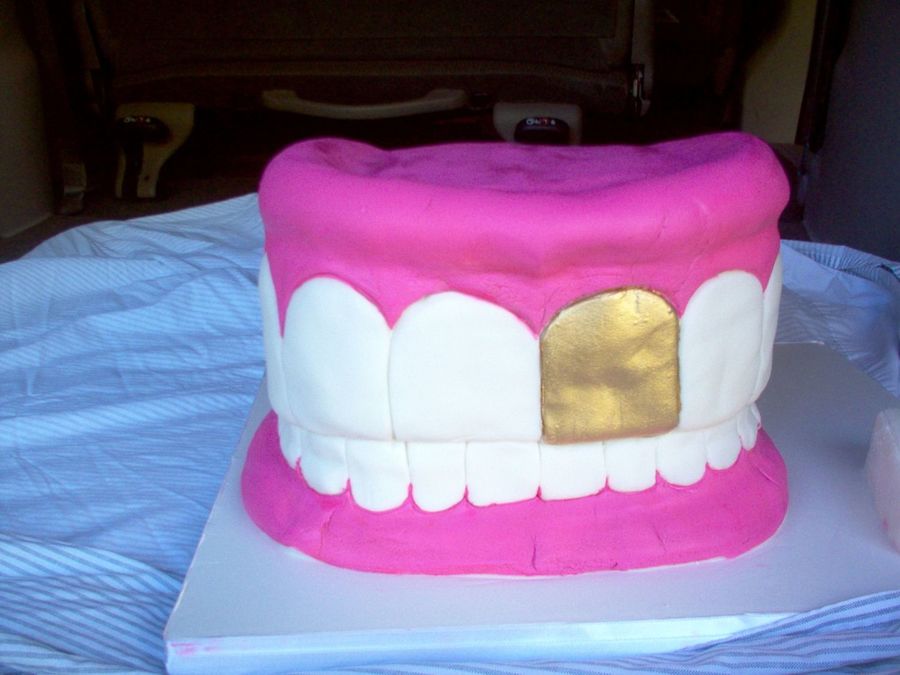 Krabbykatie on 4 Nov 2006 , 3:35pm This was a grooms cake for a dentist.There is a box of floss in gumpaste next to it .The goldtooth is painted gold dust.