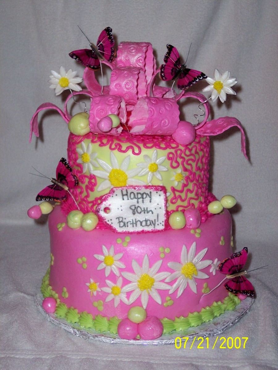 This cake was for a surprise 80th bd party to be given later today. The cake is a 6" and 8" french vanilla with vanilla butter cream. The entire cake is covered in fondant. Bow, daisies, and other decorations are all fondant. Entire cake and all decorations have been dusted with super pearl. The butterflies are leftovers from a wedding that I recently did, and they added a perfect finishing touch. I hope the recipient likes it. Thanks for letting me share my cake with you! :)