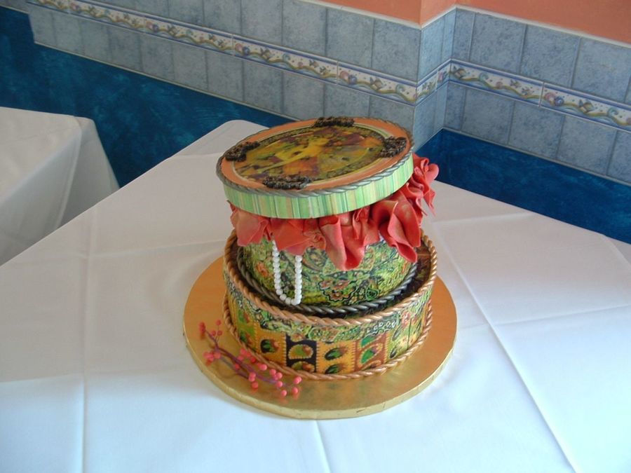 yellowdog on 21 Jul 2007 , 7:36pm WOW! real pearls? what's the "tissue paper" made from? This is such a beautifully decorated hat box---so where's the cake?