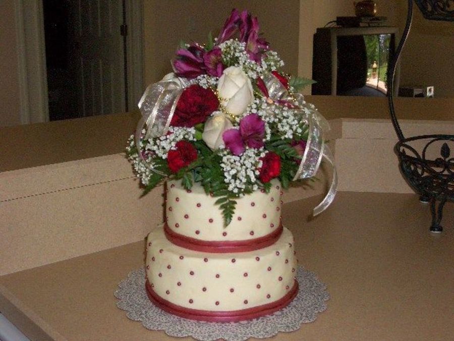 This is my first wedding cake. It is for a home reception and was requested by a good friend. The cakes are 6" and 8" covered and filled with cream cheese icing. I used claret colored luster dust on the fondant pearls and ribbon. The cake topper was HUGE, but it looked nice overall. Comments and suggestions are welcome. Thanks for looking.