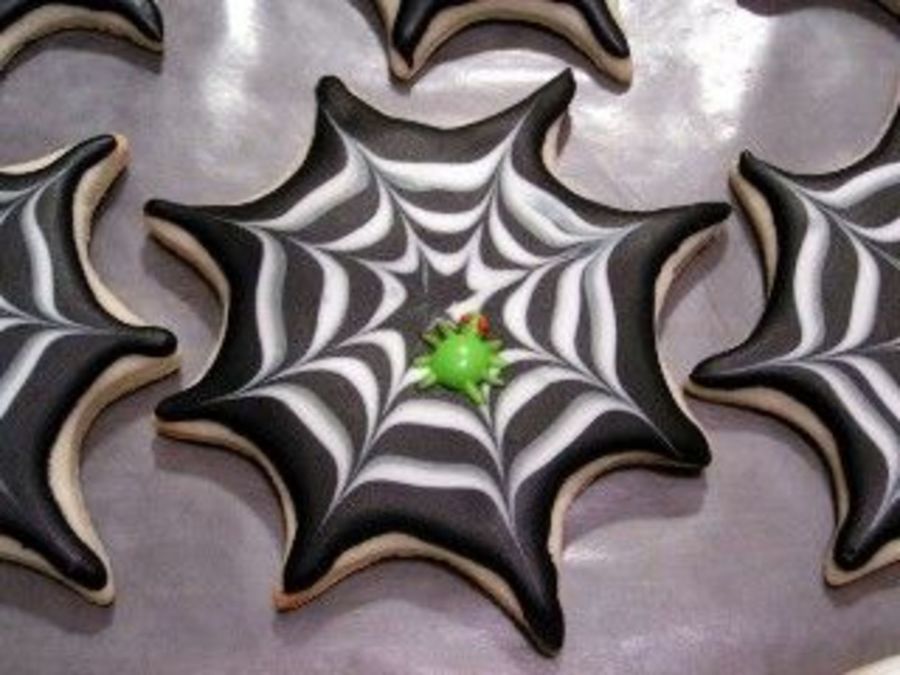 Iced with Royal. I add just a tad more water so it flows easier. Put on the black pipe on a spiral of white from the center out and then drag a cake test from center out to each point.