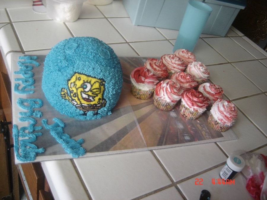 Chocolate cake in bowling cake, BCF with patrick and sponge bob on each side. Cupcakes are vanilla cake, used as bowling pins. We also turned the cake board into a bowling alley there are 2 views here
