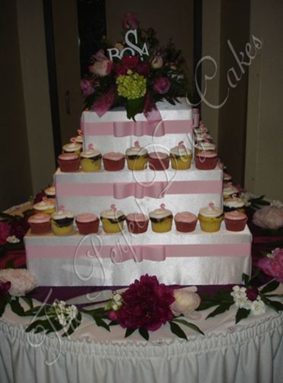 This was a cupcake cake. The stand held about 50 cupcakes and the rest were placed in the cooler. The groom's father custom made this stand. The cupcakes were raspberry with cream cheese icing and marble with whipped cream icing. The pink monogram was made with white chocolate.