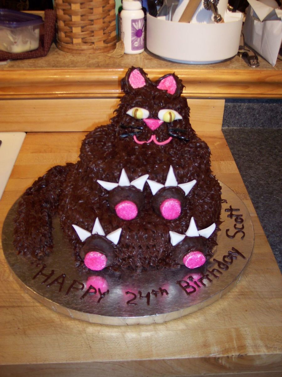 This is a cake I made for my son's birthday....he was born on Halloween so it is always a challenge to come up with something new. I got this idea out of a First magazine. It's all chocolate, marshmallow ears, donut feet, licorice wiskers and the rest is fondant. It was fun to make and he liked it.