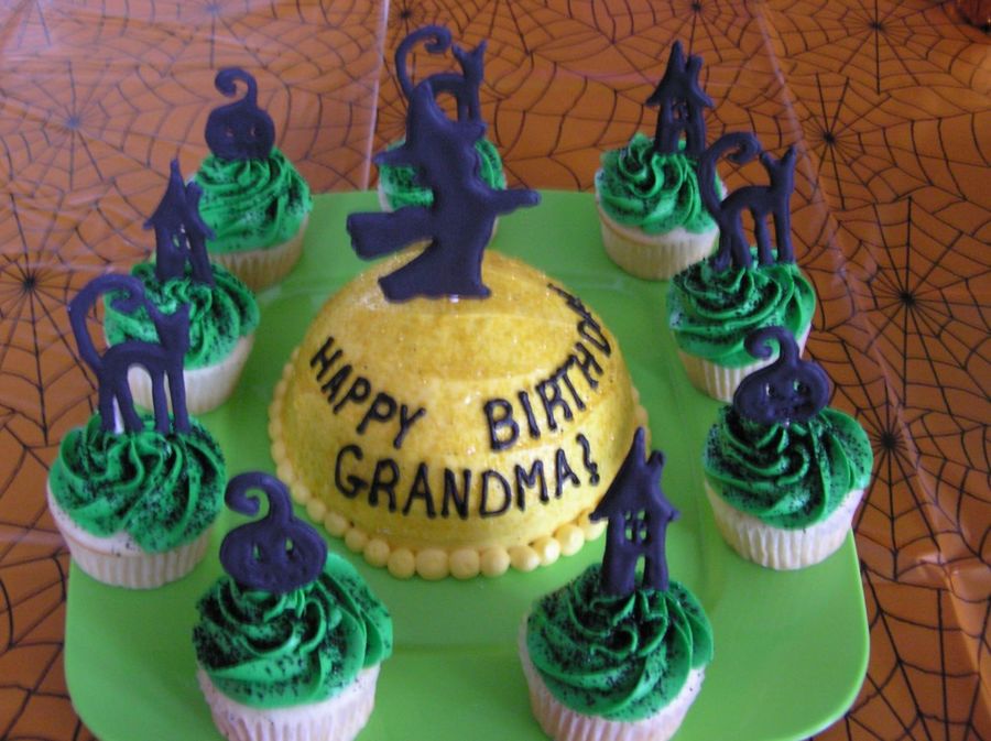 Round "moon" cake in center surrounded by cupcakes with witch, black cat, jack-o-lantern and haunted house sillouette decorations made of color-flow.
