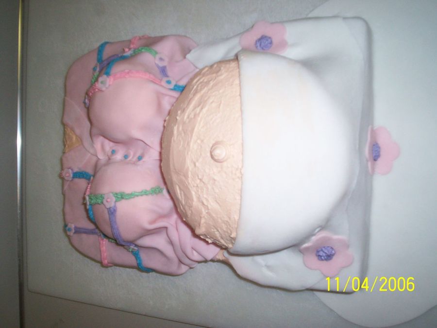 My first belly cake for my best friends surprise baby shower. I did not wait long enough to smooth the belly though. Everyone loved it! I even put a baby in the belly as a game! The shirt was made to look like her crib blanket. Thank you to kjt for the great instructions!
