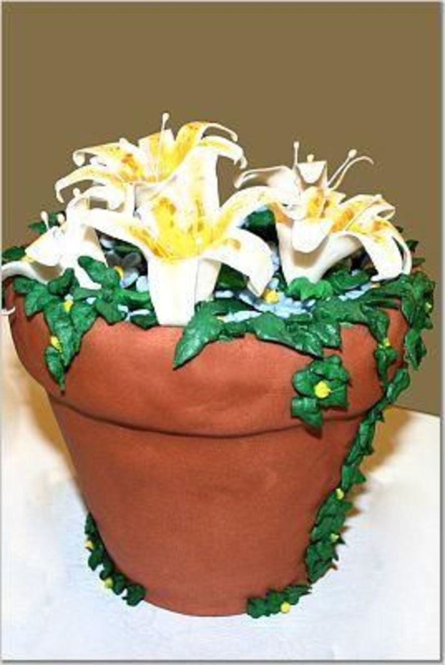 This 3D flower pot was made by baking in an actual flower pot then it was covered with fondant to resemble a real flower pot. The Lillies were made with fondant and painted useing food coloring. Oreo cookies were crumbled at the top for dirt and buttercream leaves were added to finish it off. This was our first attempt at a Flower Pot cake....the baking & decorating. It took some time, but turned out great. Everyone thought it was a real flower pot.