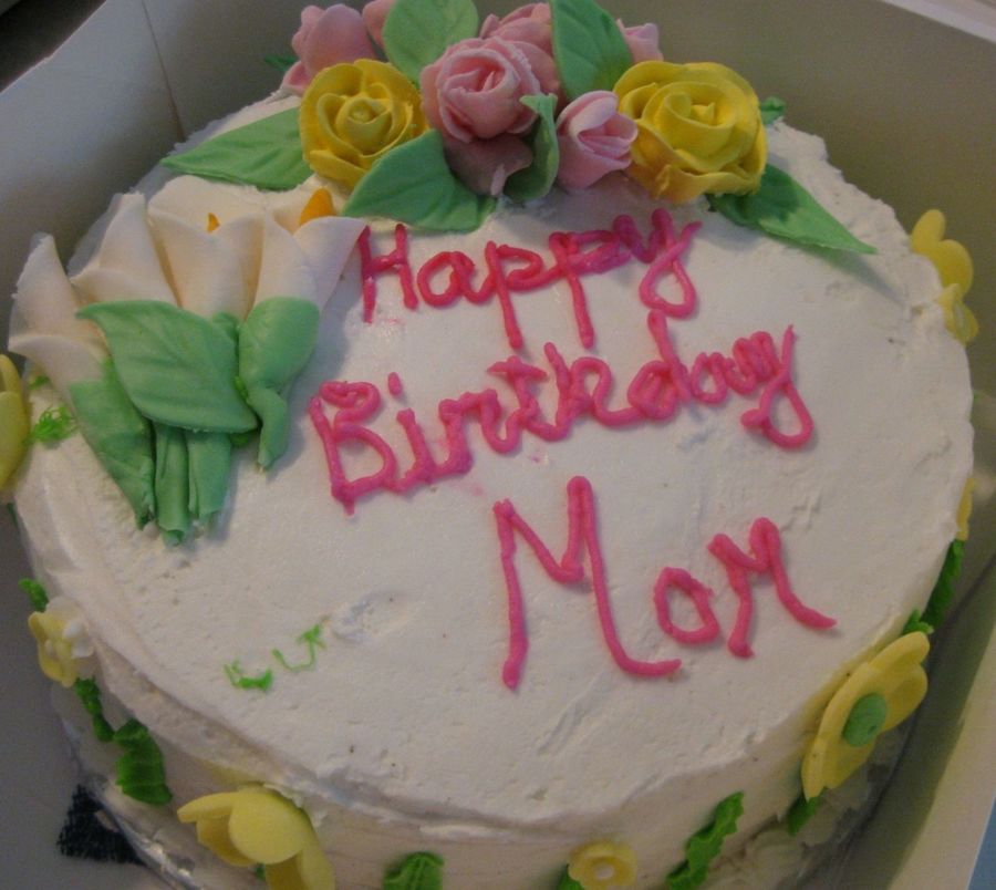 A birthday cake for my mother-in-law. It didn't come out like I had originally envisioned but everyoned liked it. It is chocolate cake with peanut butter mousse and buttercream with fondant accents. And 2 royal icing flowers. Thanks for looking