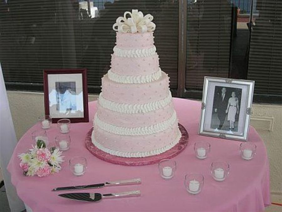 This was my first wedding cake order. Bride wanted pale pink. It's buttercream frosting with fondant pearls and bow. I was very nervous but everything turned out fine and the bride loved the cake - she said it was just like the picture she gave me.