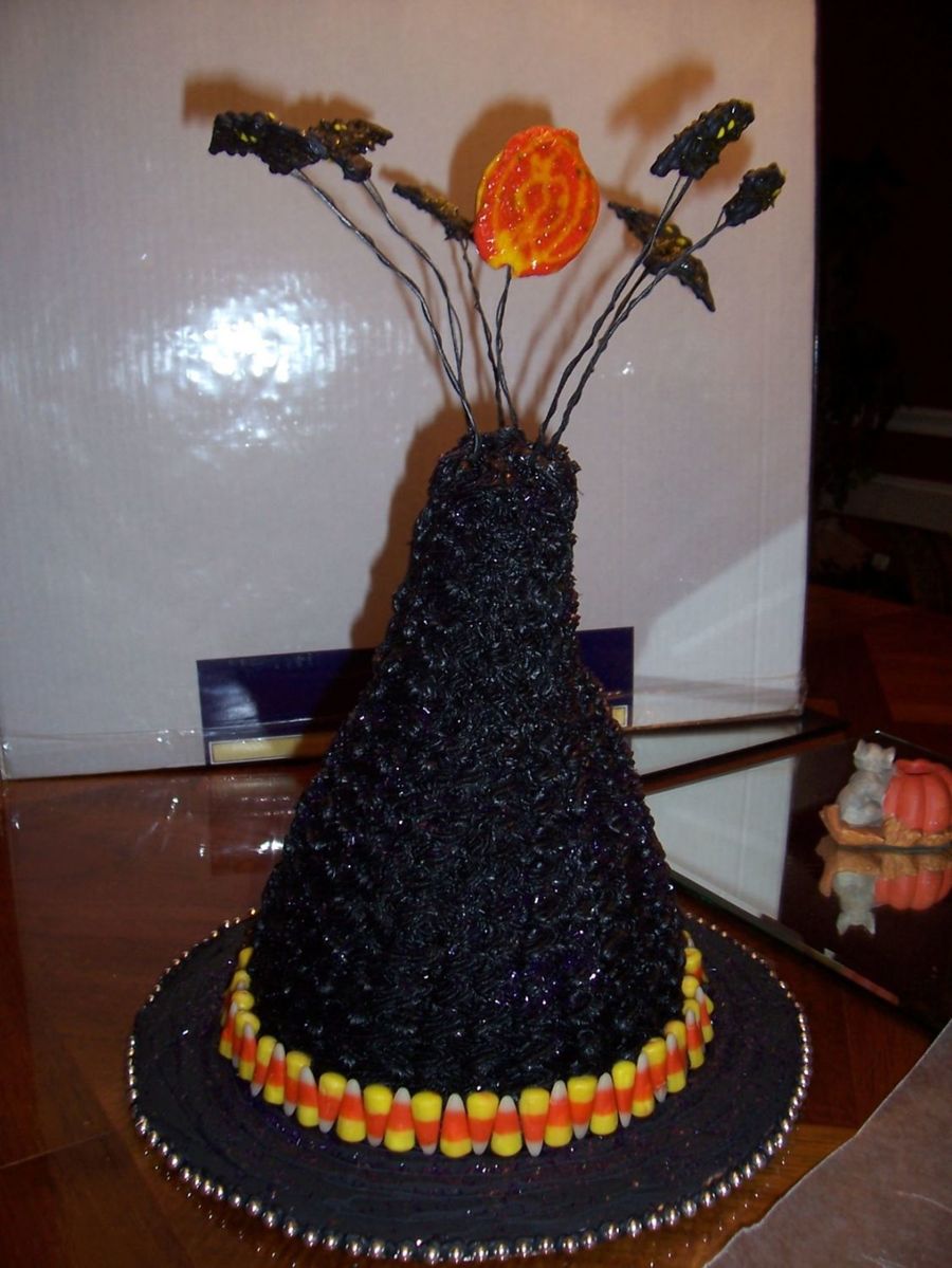 Not a very good picture, but this was my attempt at Collette Peter's witch hat cake. It was a lot of fun to do and everyone was wowed by it. It was a bit more difficult to do than what her instructions said. My husband ended up having to drive a dowel up the bottom of the cake to the top. She had no dowels in this cake at all. The very top is styrofom. The bats were on wire stuck into the styrofom through to the cake, but it still did not stay without a dowel.