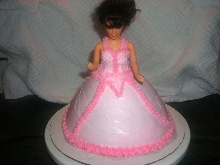 First time I made a doll cake...Buttercream frosting, pink "trim", wonderform pan.