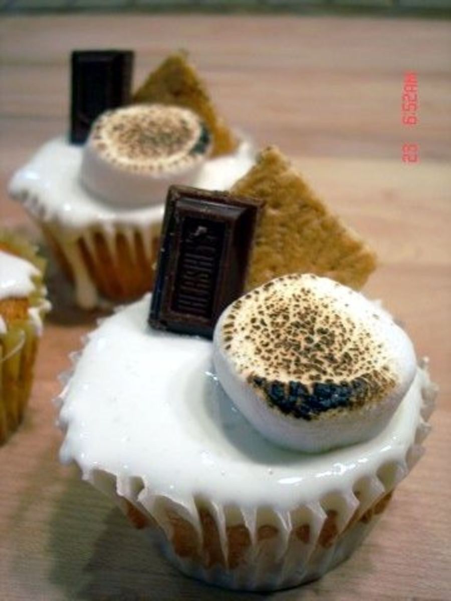 S'more cupcake with marshmallow frosting and chocolate ganache center
