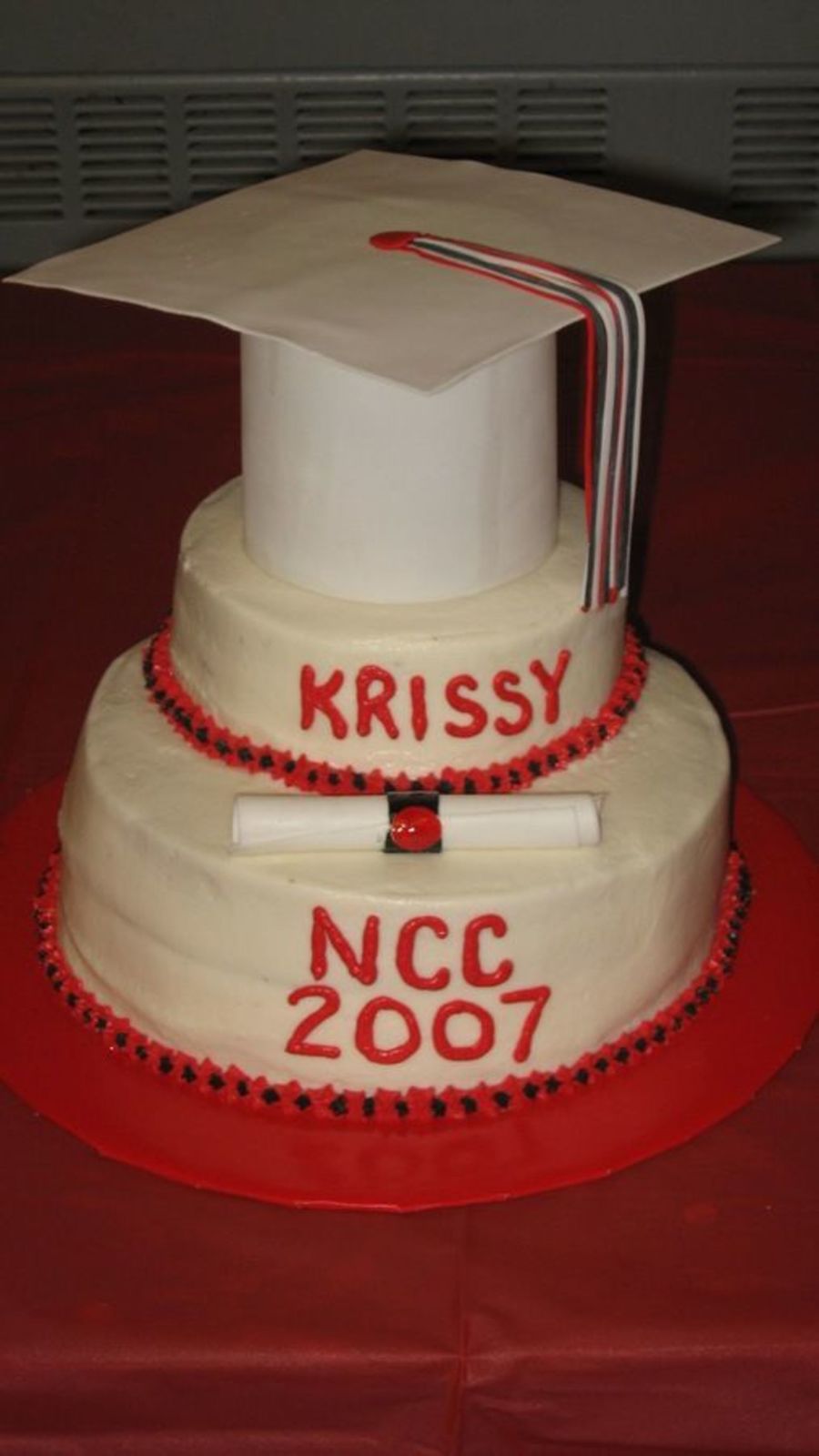 My first tiered cake made for my sister's graduation. It didn't turn out as well as I would have liked, but it's not bad. Chocolate cake, buttercream, hat/diploma are fondant. Thanks for looking!
