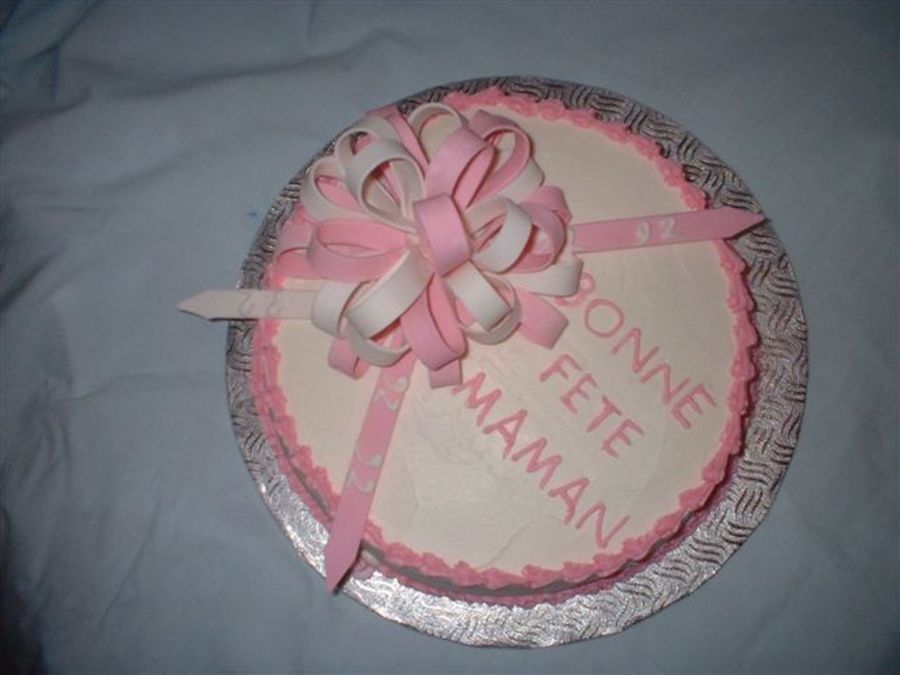 2 layer birthday cake for 92 year old!; white buttercream trimmed with pink shell border & multi-loop bow in pink & white