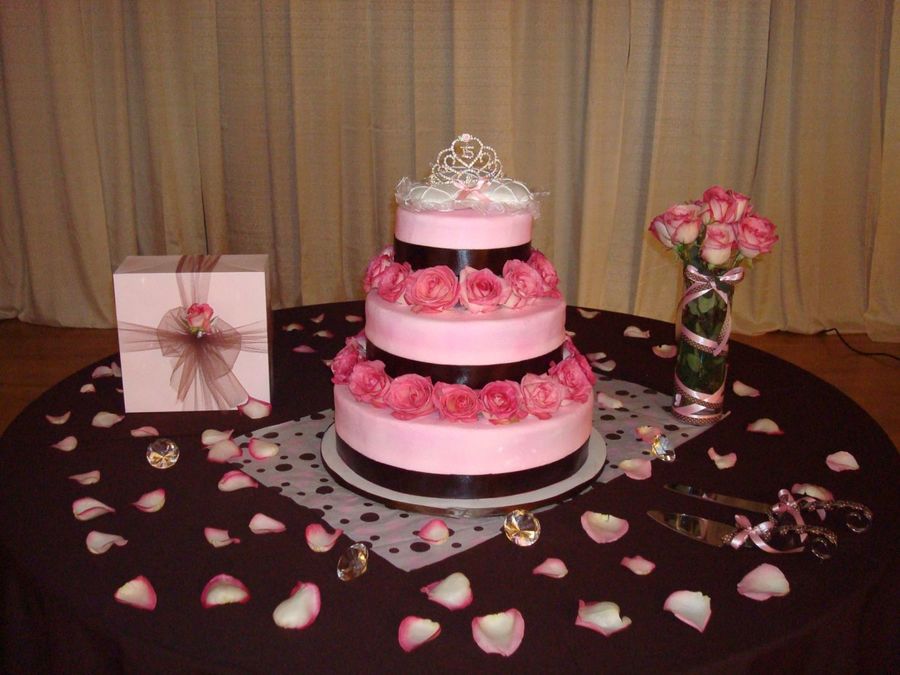 Vanilla buttercream frosted cake, airbrushed pink. I used hidden pillars and pink roses.
