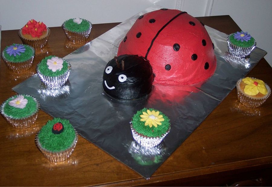 There are 3 cakes and cupcakes on one table for this birthday party for 4 kids. The Ladybug, Lightning McQueen, & a yellow flower. All surrounded by the cupcakes. All BC. The mini ladybugs are sugar candies.