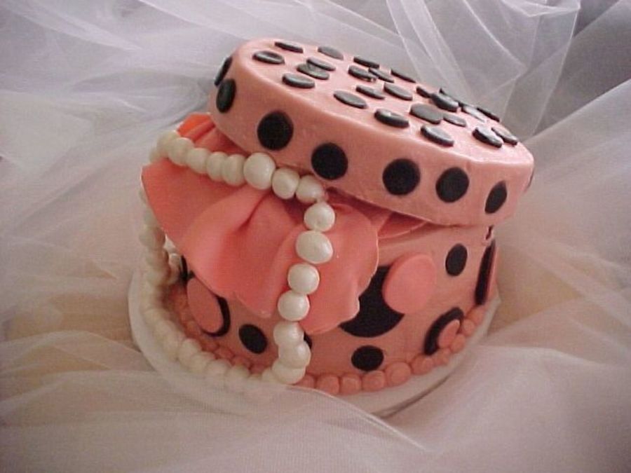 This is the first jewelry box cake I ever did and boy a learning experience. It was a chocolate cake with buttercream icing and fondant accents and fondant pearls. I think it would have looked better done entirely in fondant. It was made for a diva party a friend of mine (that has helped me sooooo much in my cake business) was having. She said they all enjoyed it.
