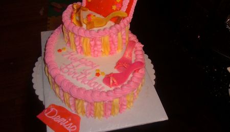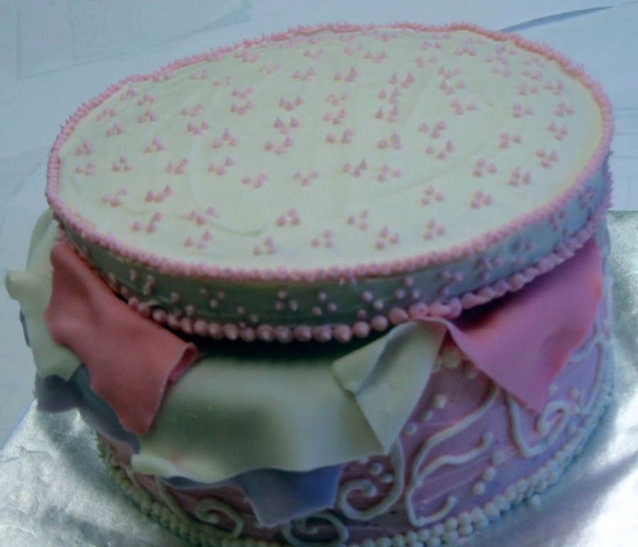 This is my first 3D cake! Golden butter hat box cake with buttercream icing and apricot filling. Decorated with dots and swirls. The lid is all cake, except for the support board and the "tissue paper" is chocolate molded to look like "tissue paper".