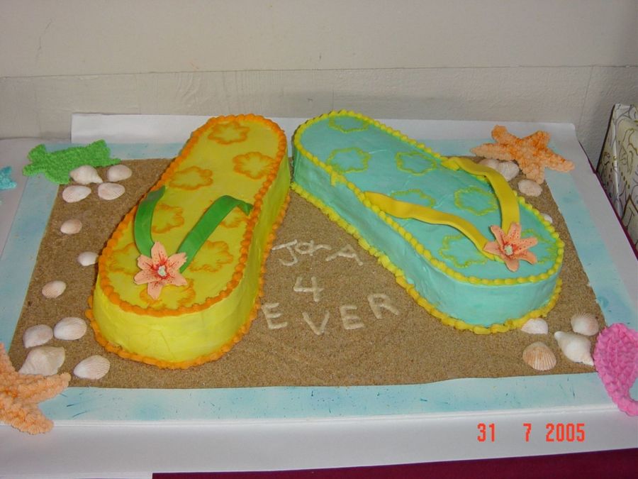 BJ on 9 Aug 2005 , 6:22pm This is a great cake! Did you use a regular cake pan and cut the flip flop shapes out?