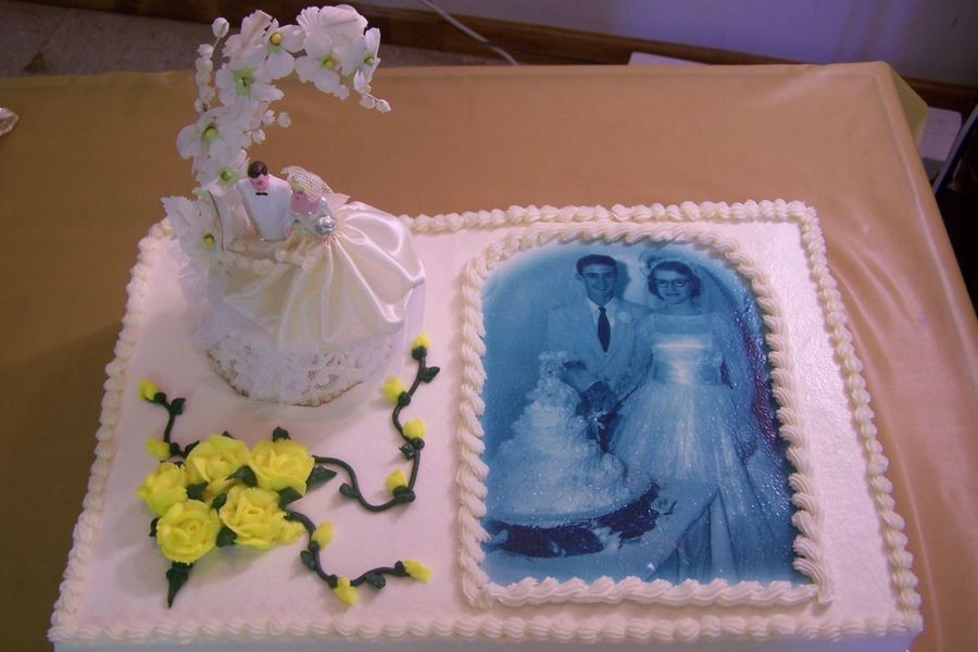 1/2 sheet cake with original wedding photo and cake topper