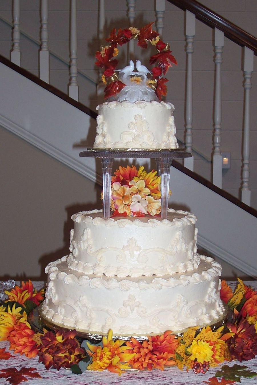 I did this cake for my sister at the end of October. They decided to get married in the fall and wanted me to do thecake. I thought a fall wedding cake was perfect. With all the beautiful fall colors. The cake has a carrot cake for the topper, chocolate cake with raspberry filling for the center cake, and white cake with strawberry filling for the bottom layer, all covered in cream cheese icing. Everyone loved the cake, especially the chocolate raspberry.