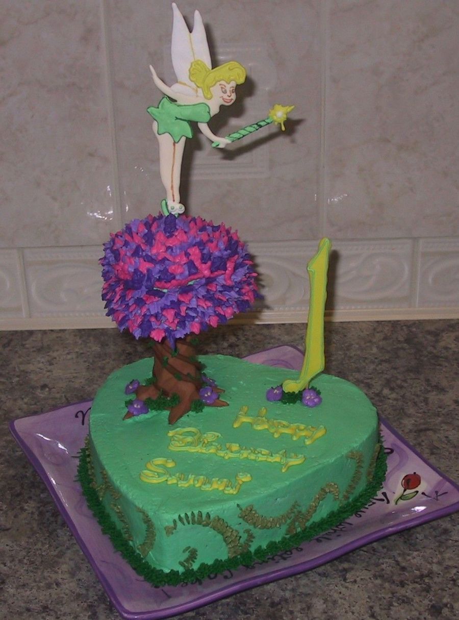 BC icing cake and tree top, tree trunk is fondant covered Pillar. 10" heart cake with 4" heart cake for tree top. Tinkerbell and all number and lettering is color flow.
