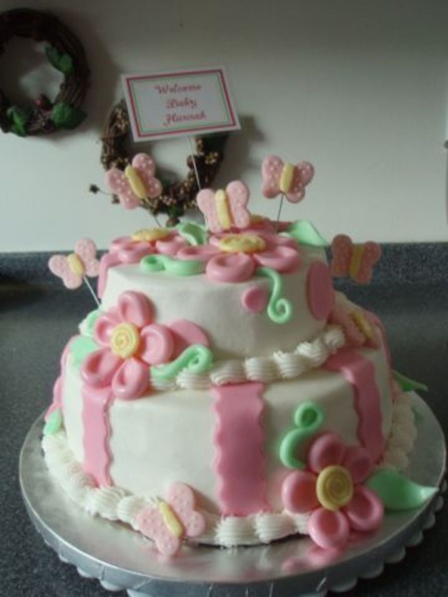 This cake was for a baby shower, it was a real hit. The tiers are 9" and 6" white cake (enhanced with pudding) and strawberry mousse filling. I did have lots of fun making this cake and got lots of oohs and aahs! Many thanks go to bjfranco for her idea and all of the assistance she gave me in creating the flowers and vines on the cake.