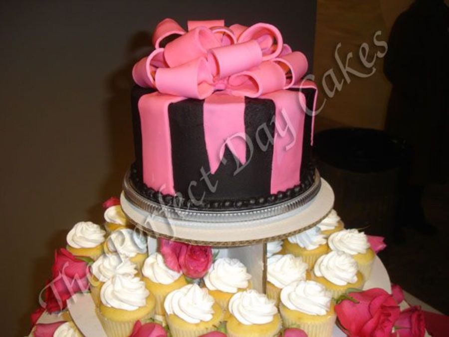 This was a display cake done for my sisters wedding (my sister does not like cake). My sisters MIL insisted on some sort of cake so she bought the cupcakes from the caterer. (I was the matron of honor so I opted out of doing the cupcakes.)