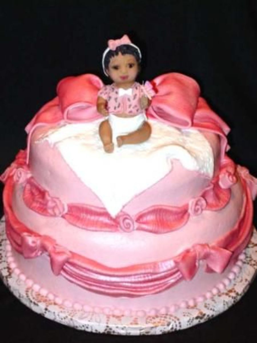 cjf on 27 Apr 2005 , 2:42pm The baby is made using gumpaste and the ribbons from a fondant/gumpaste mix. The 'shiny' is achieved by dusting it with luster dust.