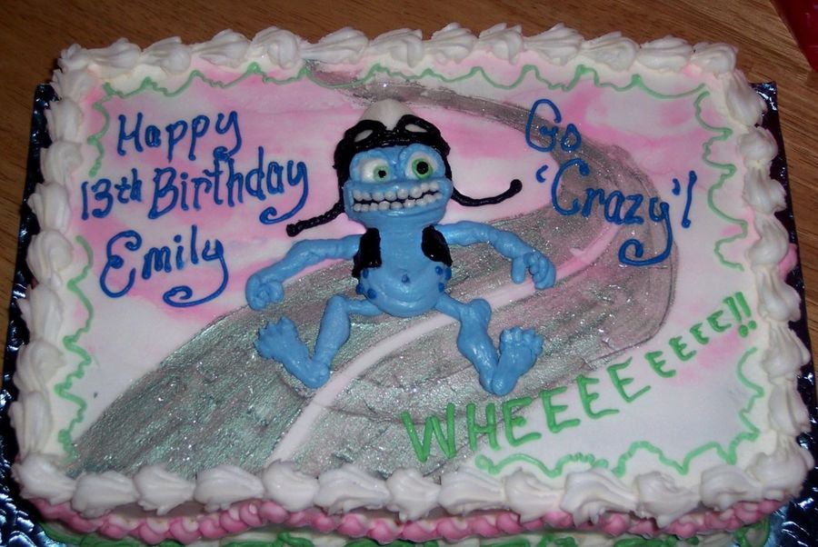 My niece wanted a 'Crazy Frog' cake and I'd never even heard of him! Design compiled from internet images. All BC with a road of silver luster dust mixed with vodka and carefully painted on after the BC crusted. She loved it.