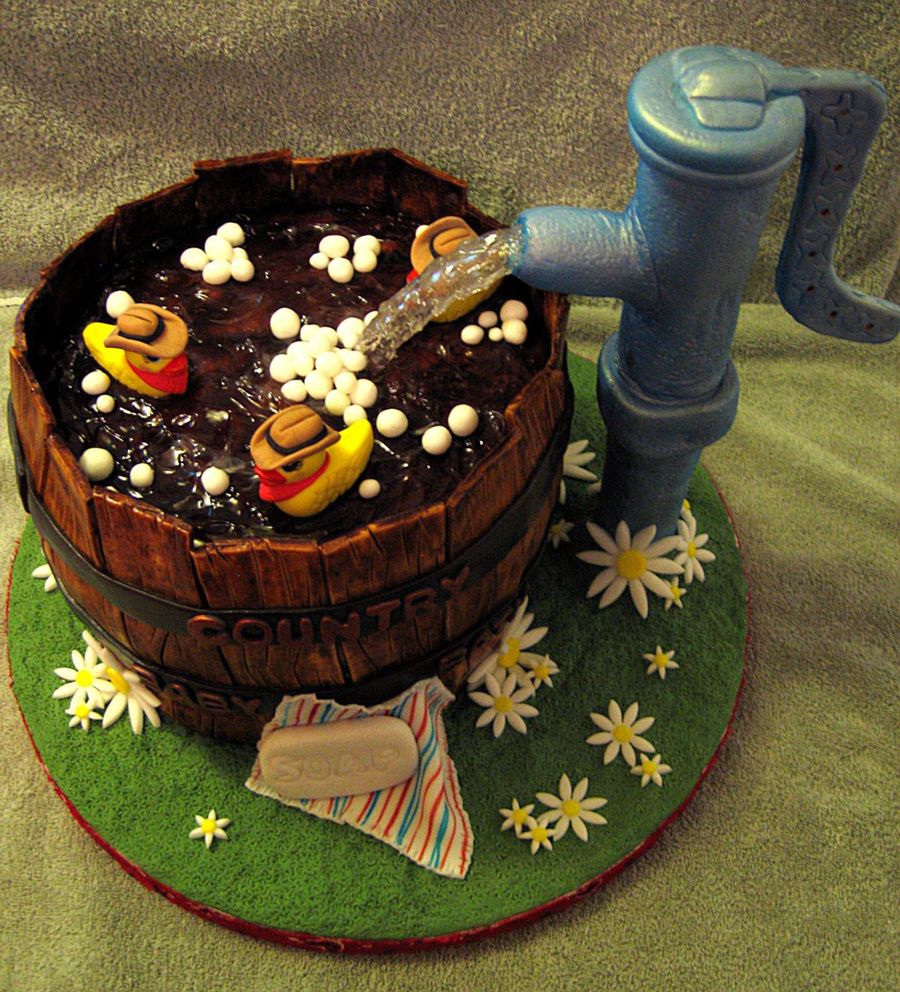 You are so funny, cookinmamma! Actually the cake comes up to approx. 3/4" from the top slate. The cake is colored with fondant (just a tad darker than the fondant used on the sides of the barrell), it is then coated with clear piping gel, giving it the illusion that the water is filling up the barrell. Soooooo, who's doing the dishes tonight? LOL