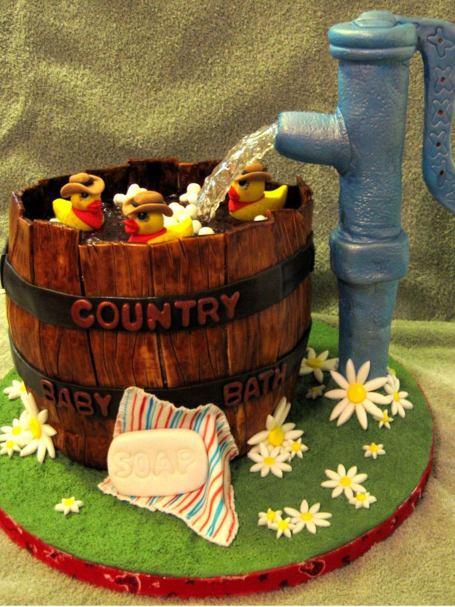 I was up all night making this cake...but I feel it was worth it! It was created for a western and rubber ducky themed baby shower. The men, women and children were all invited. The tables were decorated in denim with red bandana runners. In the center of the tables were mason jars, decorated with rubber ducks and filled with daisies. So, I got all the elements in the cake. It was a huge hit when I dropped it off!