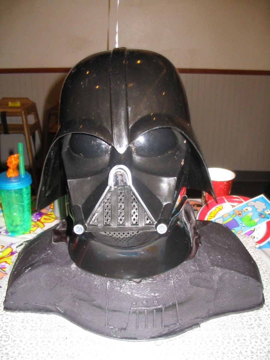I made this for my son's 5th bday the pic does not show that the cake is as black as it really is.And i don't have a clue where all the spots came from. used my son's Darth Vader mask for the head. Yes the idea came from the spiderman cake but insread of using a wig head I used the doll cake pan. I thought it would be easier to add the mask on to. I never trust kids and a cake in Chuck E Cheese! LOL! Turned out to work well. I also made a cape but you can't really see it! :( thanks for looking!